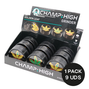 Grinder CHAMP diseño hoja en gold. Dientes afilados de precisión que garantizan un triturado uniforme. Construcción robusta y duradera. Cierre magnético seguro.